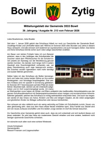 Bowil Zytig Mitteilungsblatt der Gemeinde 3533 Bowil 39. Jahrgang / Ausgabe Nr. 213 vom Februar 2026 Liebe Bowilerinnen, liebe Bowiler Seit dem 1. Januar 2026 gehört das Schulhaus Hübeli nur noch zur Geschichte der Gemeinde Bowil. Unzählige Kinder und Lehrkräfte haben seit 1959 bis im Sommer 2025 viele Stunden und Jahre in diesem Haus verbracht. Und alle erinnern sich bestimmt an wunderschöne und auch harzigere Zeiten. Das kleine und feine Schulhaus könnte sicher auch viele lustige Geschichten erzählen. Am Basar vom letzten Frühjahr habe ich zum Beispiel erfahren, dass in den Anfängen des Schulbetriebs die Duschen nebst dem Pflichtduschen für die Schüler/-innen jeweils am Samstag von der Bevölkerung genutzt werden konnten. Da damals noch lange nicht in jedem Haushalt eine Duschmöglichkeit vorhanden war, sei diese Dienstleistung auch rege beansprucht worden. Die Duschen wurden irgendwann nicht mehr benötigt und ausser Betrieb genommen. Selber habe ich das Schulhaus als Mutter kennengelernt und habe dort meine beiden Söhne an ihre ersten Kindergarten- und Schultage hineinbegleitet. Drei weitere Anlässe sind mir speziell in Erinnerung geblieben: Im Sommer 2011 fand draussen auf dem Platz ein erster kleiner Abschied statt, nämlich als die Unterstufe aufgehoben und im Dorf zusammengelegt wurde. Ich meine an Weihnachten zuvor haben wir Kinder und Eltern anlässlich des traditionellen Adventsbastelns aus der ganzen Schulhausfensterfront mit Seidenpapierkunstwerken einen riesigen und wunderschönen Adventskalender gebastelt, welcher das Schulhaus so richtig weihnächtlich erleuchten liess. Und auch nie vergessen werde ich das Chaos von Autos, Kindern und Skis und übrigem Gepäck, als die vielen aufgeregten und glücklichen Kinder ins Skilager aufbrachen oder daraus heimkehrten. Nun schauen wir also vielleicht auch ein wenig wehmütig auf Zeiten mit Schulbetrieb zurück, freuen uns aber gleichzeitig sehr, dass aus dem Haus etwas Neues entstehen kann. Eine Familie aus Zäziwil wird sich ein neues Zuhause erschaffen und ihre beiden Jungs werden im Dorf die Schule besuchen. Zur Geschichte einer Gemeinde gehört eben auch, dass sie sich entwickelt und sich laufend dieses und jenes verändert. So wird das Haus ein moderneres Gesicht erhalten und eine andere, bestimmt nicht weniger spannende Geschichte schreiben. Ich wünsche euch allen noch eine schöne Winterzeit. Ursula Schüpbach Gemeinderätin Ressort Finanzen und Liegenschaften